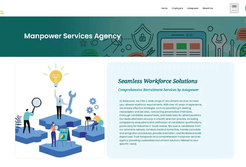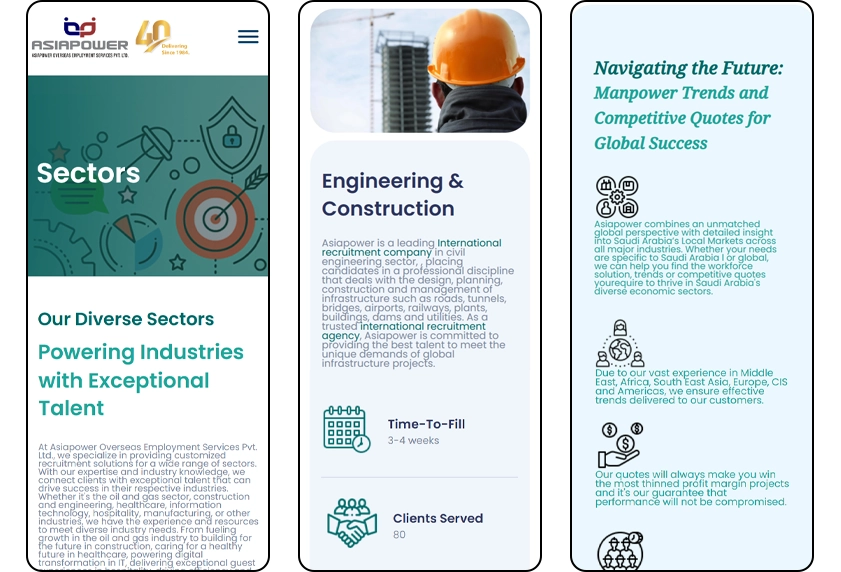 A sector-first content structure was implemented, allowing each industry vertical to be clearly defined and easily navigable. Real recruitment case studies and client collaborations were integrated into the website to demonstrate proven expertise and build trust. Strong emphasis was placed on credibility through testimonials, certifications, and global deployment statistics, reinforcing Asiapower’s authority in the recruitment space. The final platform positions the company not just as a manpower supplier, but as a specialized global recruitment partner with deep industry expertise and a strong international footprint.