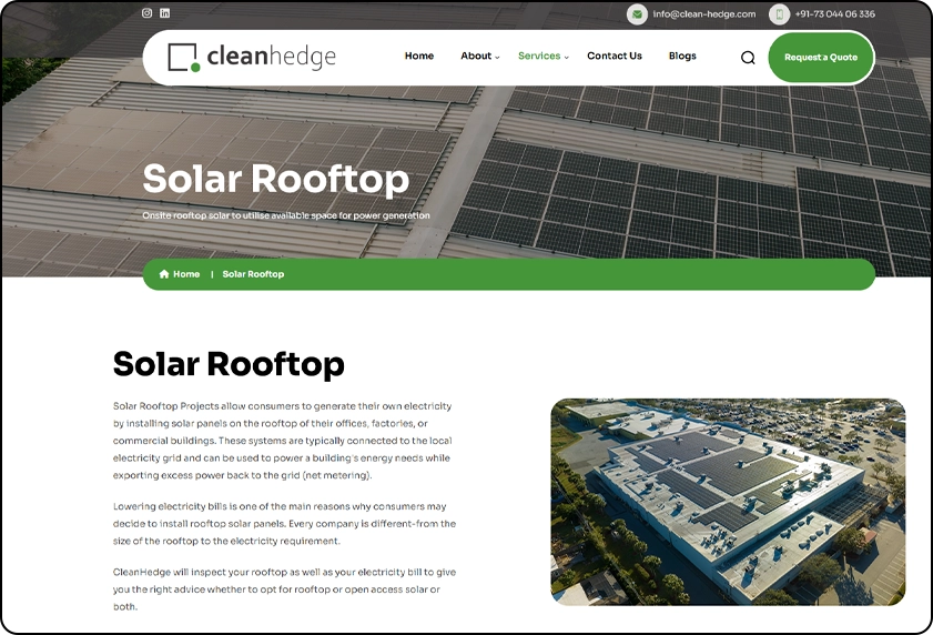 The website was enhanced with updated graphics, refined imagery, and structured content flows to improve engagement and readability. Functional elements designed to support lead generation and user interaction were incorporated, including a WhatsApp chat feature to enable quick and direct communication. The final outcome was a scalable digital platform that aligned with Clean-hedge’s position as a forward-looking renewable energy company and supported long-term growth.