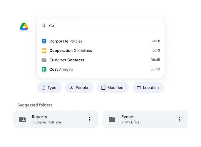 Drive's search, powered by AI, offers speed and reliability by quickly surfacing relevant results based on your activities.