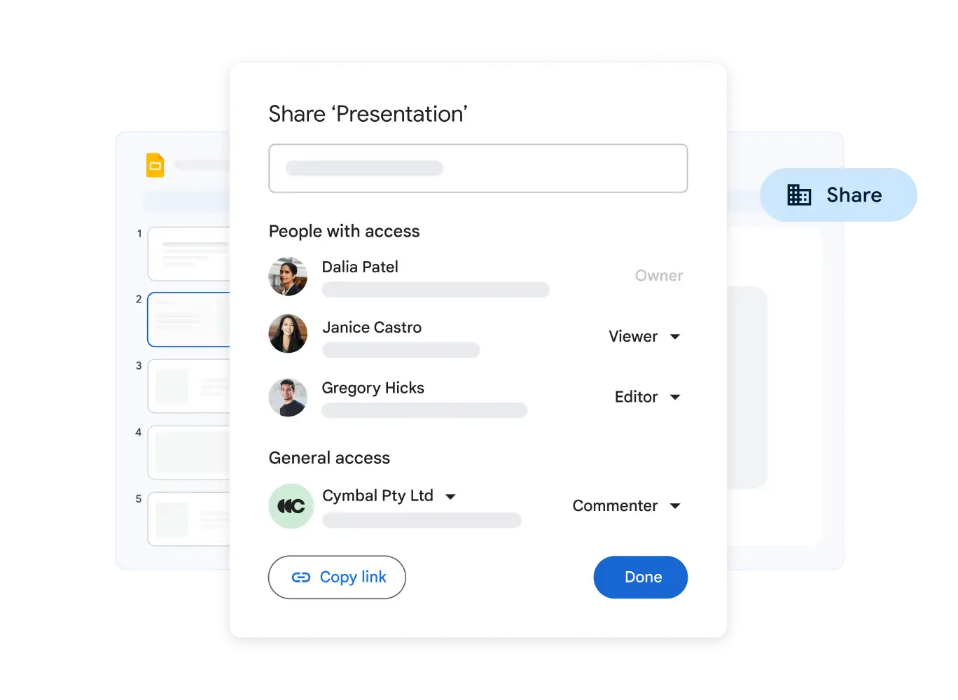 Easy-to-manage sharing permissions allow you granular control over who gets to edit, comment or view your slides.