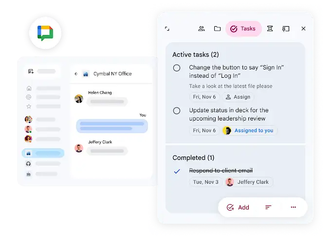 Stay focused and keep track of your tasks directly in Gmail, Calendar, Chat and Docs.