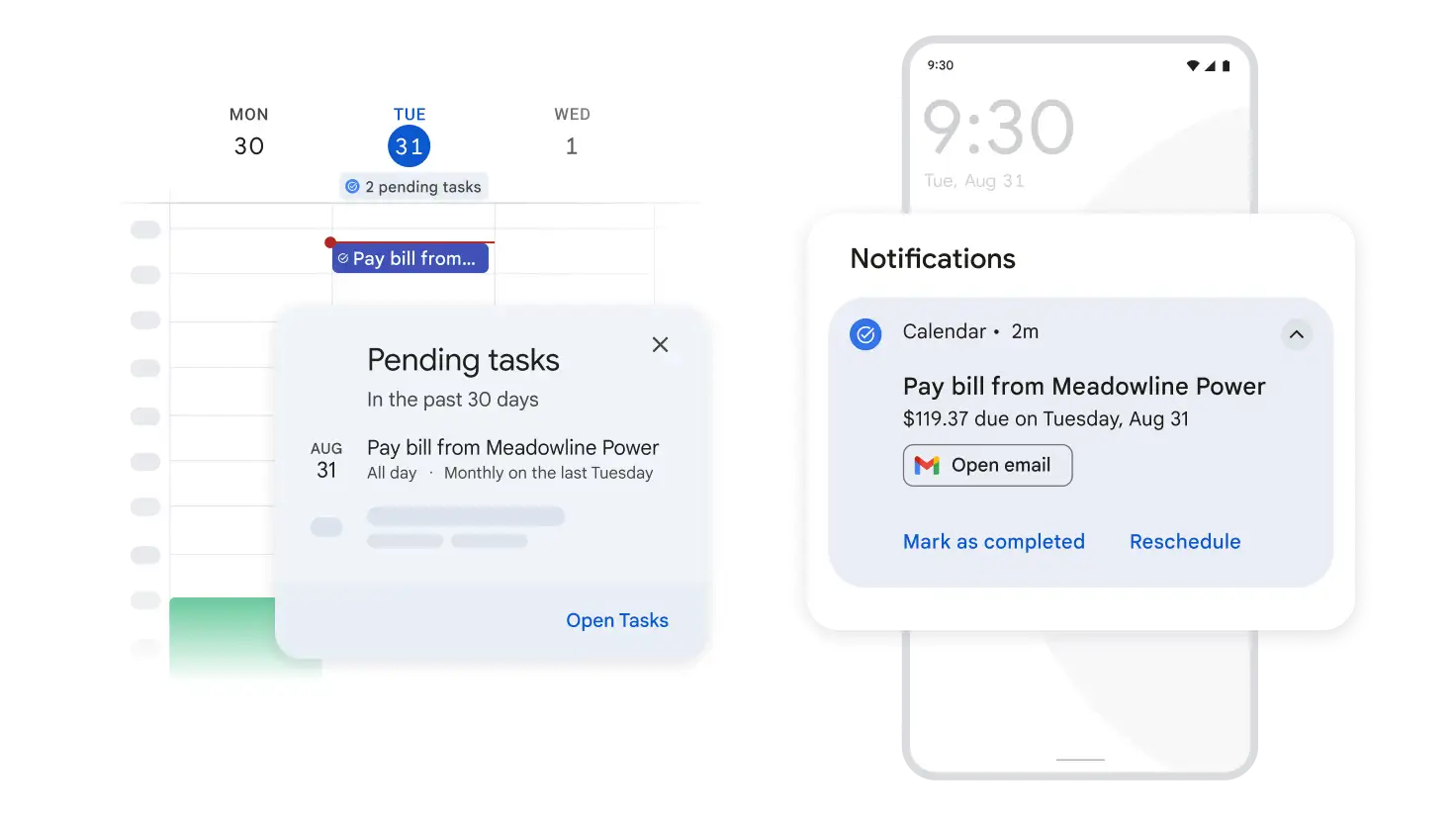 Add a date and time to any task and it will automatically appear in your Google Calendar – plus, you'll get reminders to help you stay on track and in control of your day. You can also add a duration and mark yourself as busy to avoid interruptions.