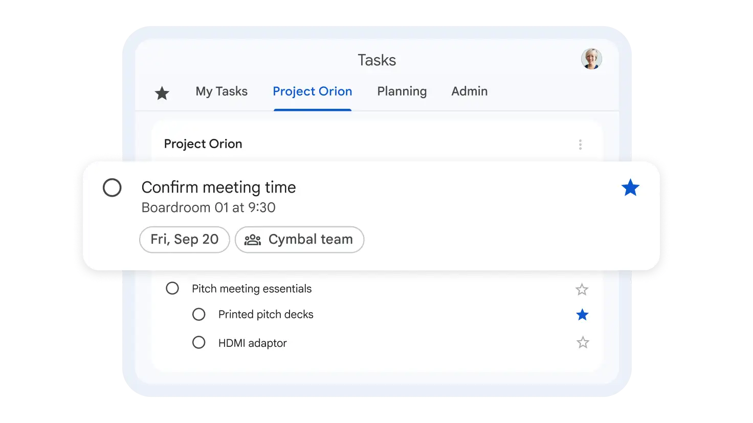 Use separate task lists for different jobs, topics or clients. Plus, prioritise your tasks by marking the most important ones with a star so that they're easy to find.