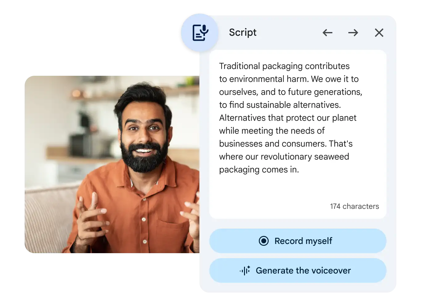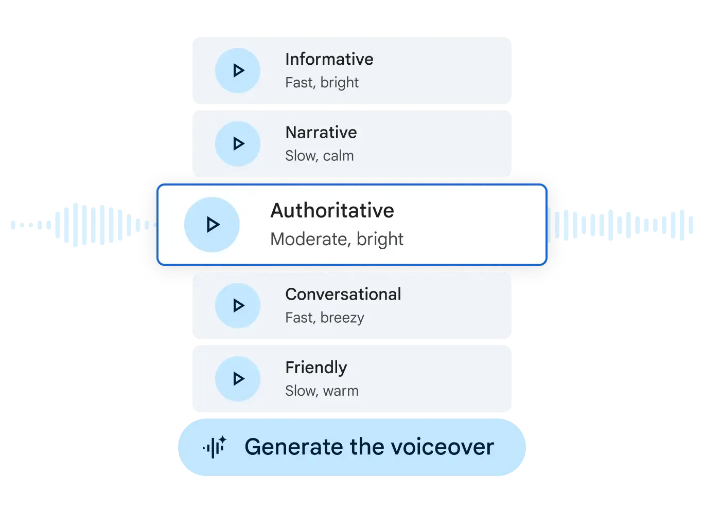 Choose from a variety of preset professional-sounding voice-overs and let Gemini in Vids handle the audio.