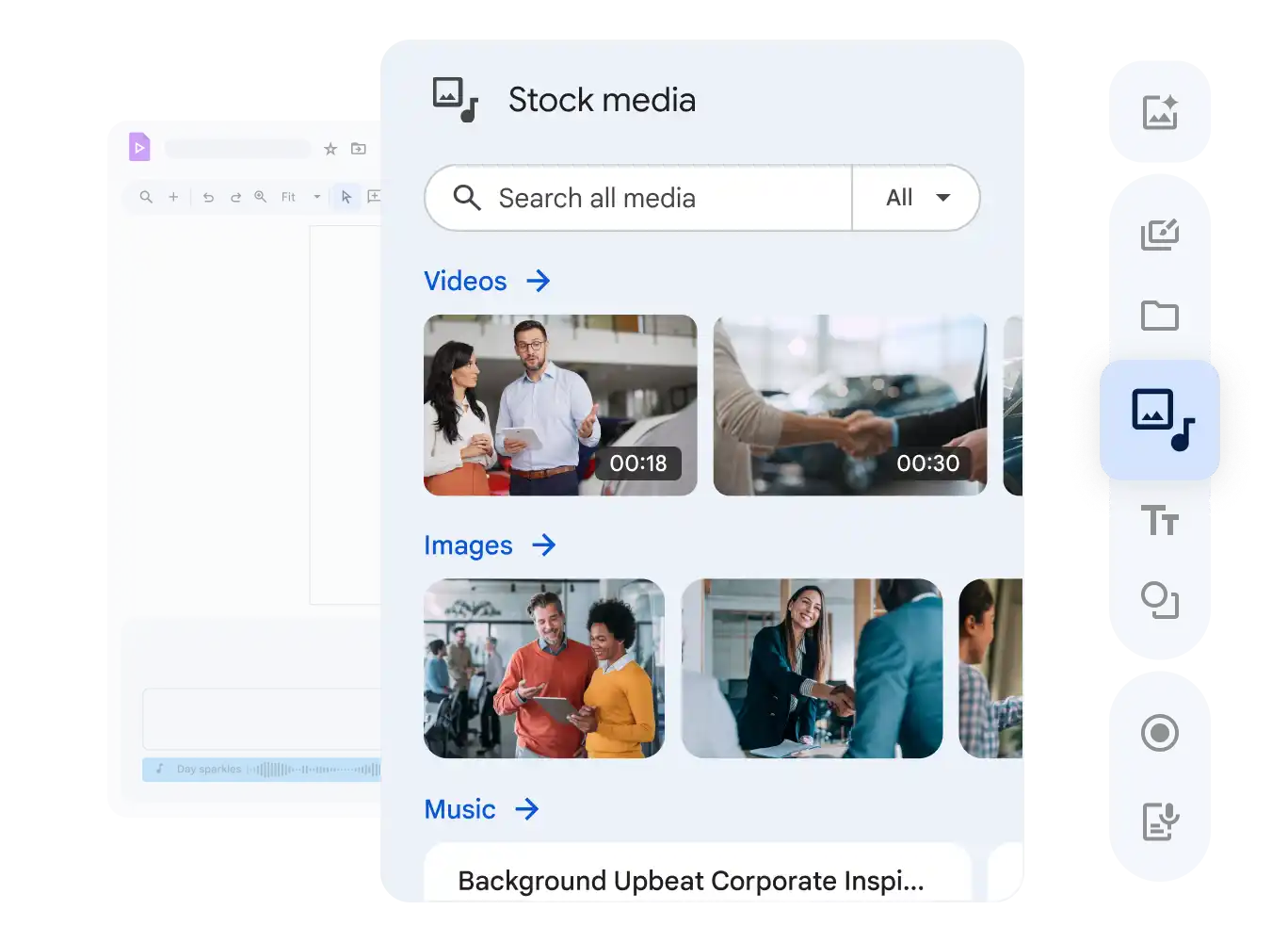 Enhance scenes with high-quality, royalty-free stock media, music and more from our content library, or generate an image using Gemini in Vids.