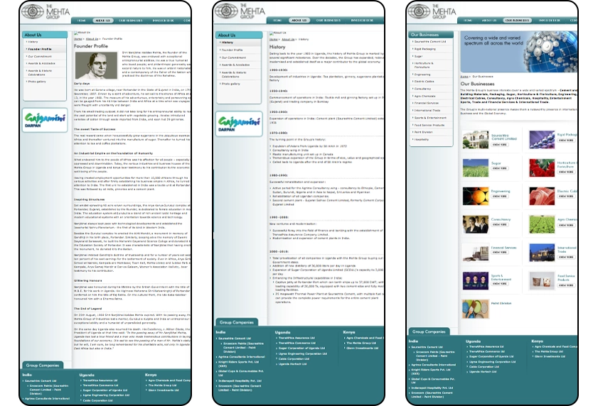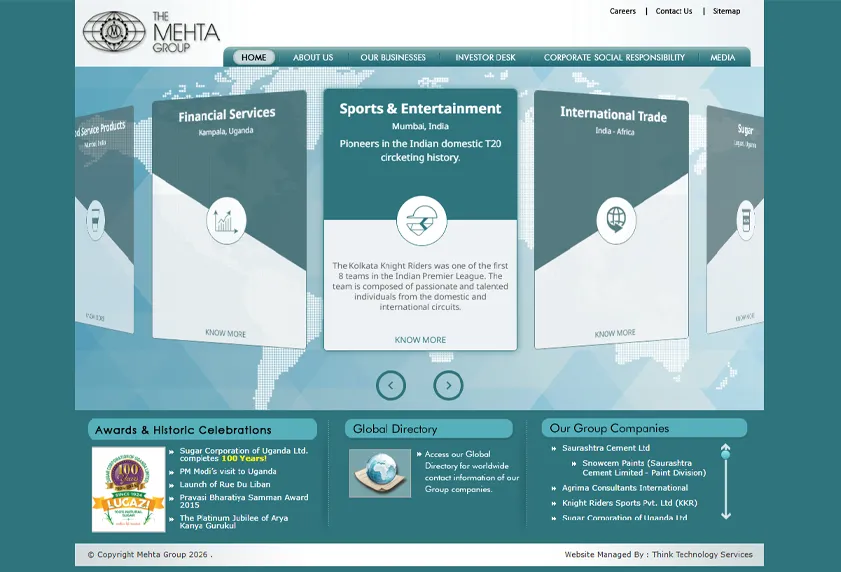 The Mehta Group website was developed to represent a highly diversified global business operating across multiple industries including cement, sugar, engineering, packaging, financial services, and international trade. The objective was to create a unified digital platform that clearly showcases the group’s vast portfolio of businesses, global presence, and legacy. The website includes structured sections such as “Our Businesses,” “Investor Desk,” “CSR,” and “Media,” allowing users to explore different verticals in an organised manner. Each business division is presented with dedicated highlights, helping users understand the scale and diversity of operations across regions like India, Africa, and international markets.