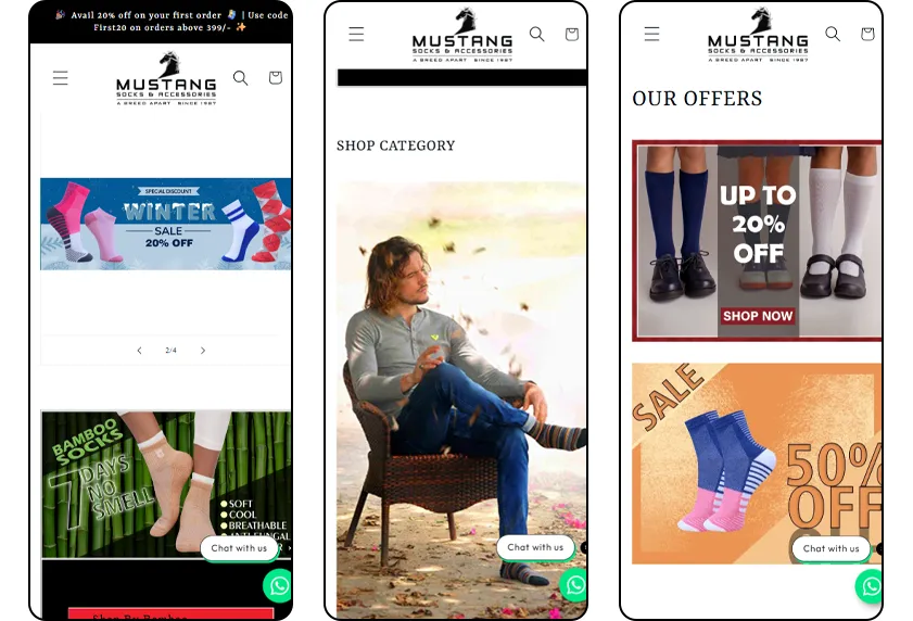 Mustang Socks has been a long-standing client, initially operating with a basic website that only displayed products and relied on enquiry-based conversions. While they were also selling on marketplaces like Amazon and Flipkart, heavy commission structures and limited brand control restricted their growth. After consulting with Think Technology Services, the decision was made to build a dedicated Shopify store to establish a direct-to-consumer channel. The team developed a complete e-commerce ecosystem by setting up the Shopify store, integrating secure payment gateways, delivery and logistics systems, and syncing the product catalogue with Meta for marketing campaigns. Products were systematically organised and categorised to improve user experience and discoverability.