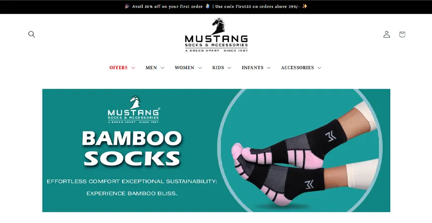 A Shopify-based e-commerce solution was implemented to provide a scalable and user-friendly platform for Mustang Socks. Shopify’s robust infrastructure enabled seamless payment processing, easy product management, and reliable order handling. The website was designed with a clean and intuitive interface, allowing customers to browse and purchase effortlessly. Backend integrations with delivery partners and Meta Pixel enabled efficient order fulfilment and performance-driven marketing campaigns.