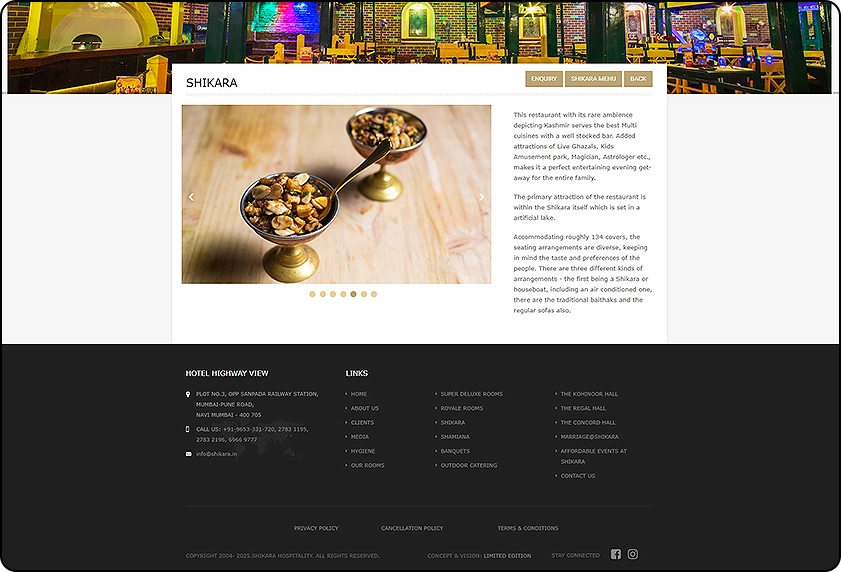 The Shikara website was designed as a central digital hub representing multiple business verticals under one umbrella, including hospitality (Hotel Highway View), dining (Shikara Restaurant), and real estate (Shikara Constructions). The platform highlights the brand’s diverse offerings in a structured manner, allowing users to explore hotel stays, restaurant experiences, and property developments seamlessly from a single interface. The website showcases key highlights such as deluxe accommodations, Kashmiri-themed dining experiences, and real estate projects like Shikara Heights, while maintaining a consistent brand narrative across all segments.