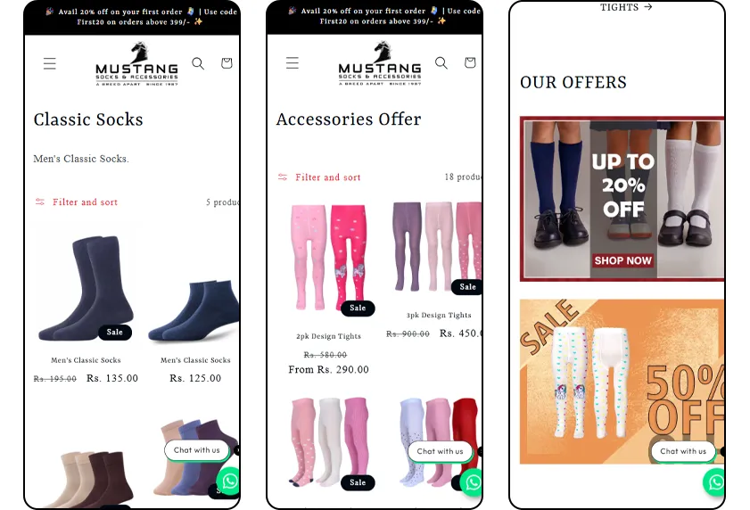 Mustang Socks has been a long-standing client, initially operating with a basic website that only displayed products and relied on enquiry-based conversions. While they were also selling on marketplaces like Amazon and Flipkart, heavy commission structures and limited brand control restricted their growth. After consulting with Think Technology Services, the decision was made to build a dedicated Shopify store to establish a direct-to-consumer channel. The team developed a complete e-commerce ecosystem by setting up the Shopify store, integrating secure payment gateways, delivery and logistics systems, and syncing the product catalogue with Meta for marketing campaigns. Products were systematically organised and categorised to improve user experience and discoverability.