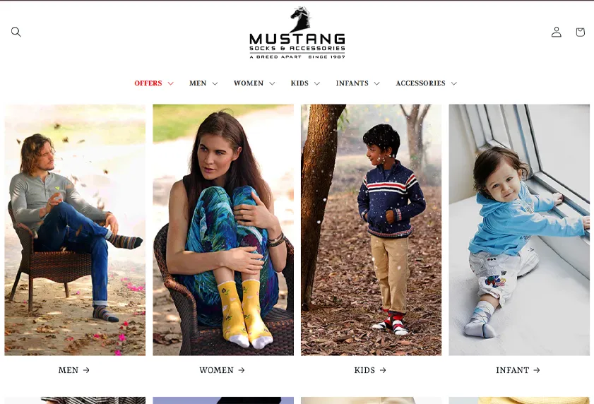 A Shopify-based e-commerce solution was implemented to provide a scalable and user-friendly platform for Mustang Socks. Shopify’s robust infrastructure enabled seamless payment processing, easy product management, and reliable order handling. The website was designed with a clean and intuitive interface, allowing customers to browse and purchase effortlessly.Backend integrations with delivery partners and Meta Pixel enabled efficient order fulfilment and performance-driven marketing campaigns.
