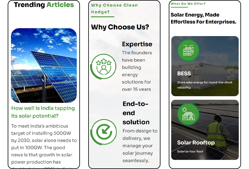 The website was enhanced with updated graphics, refined imagery, and structured content flows to improve engagement and readability. Functional elements designed to support lead generation and user interaction were incorporated, including a WhatsApp chat feature to enable quick and direct communication. The final outcome was a scalable digital platform that aligned with Clean-hedge’s position as a forward-looking renewable energy company and supported long-term growth.