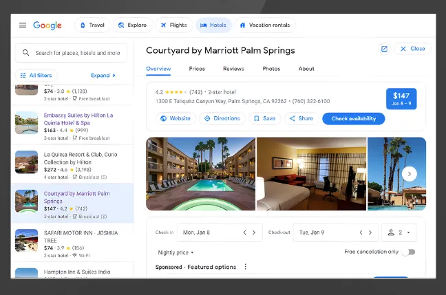 Google Hotel Ads display your hotel availability and rates on Google Search, Maps, and the Assistant.