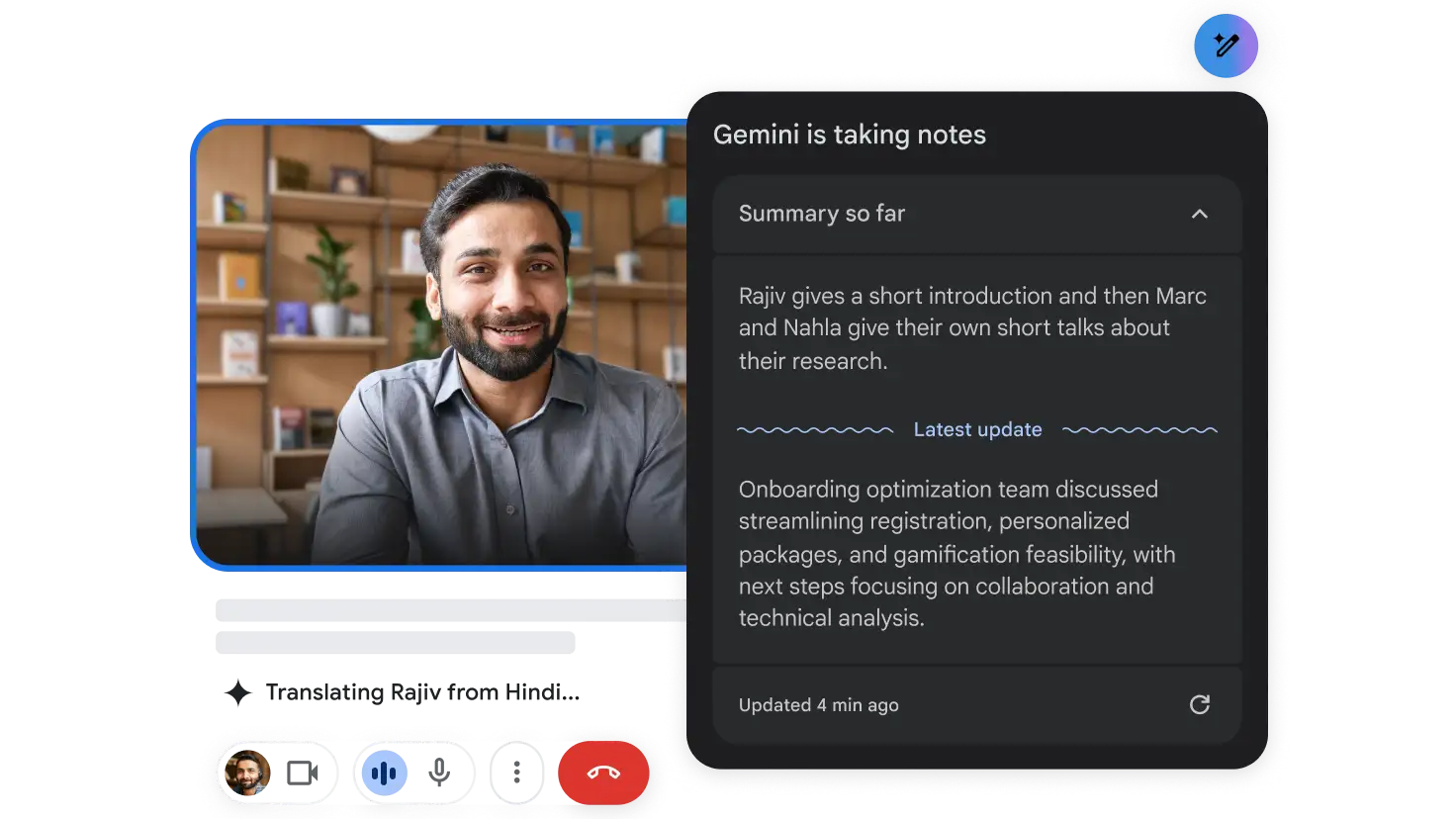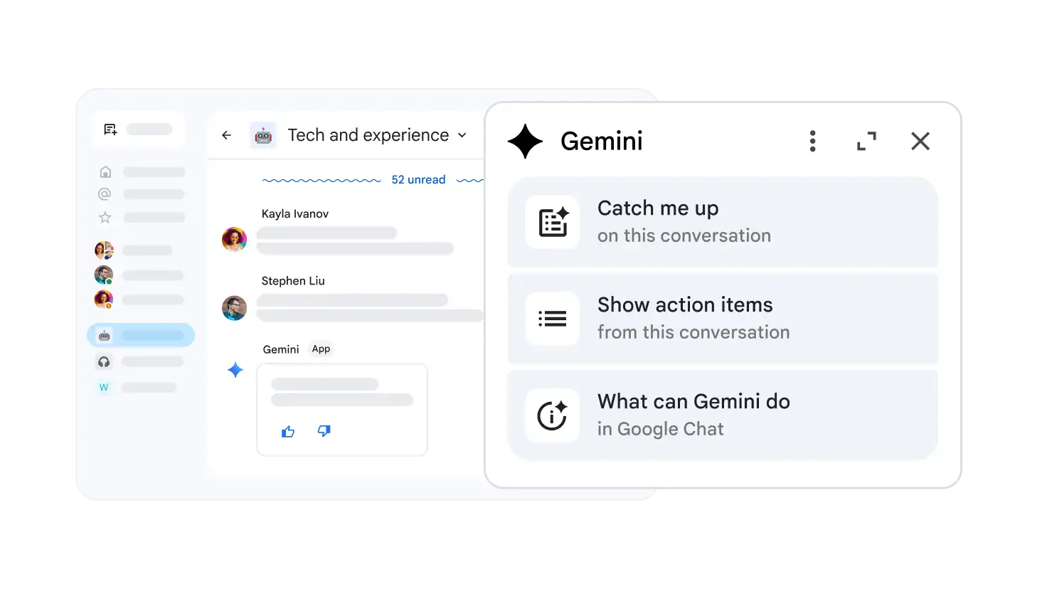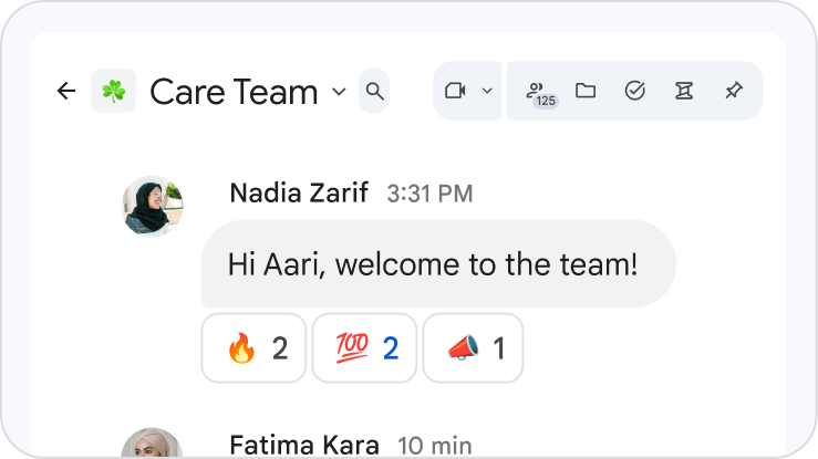 With Gemini in Chat, you have an always-ready AI partner to catch you up on the conversation, share action items, translate in real time, brainstorm ideas and more.