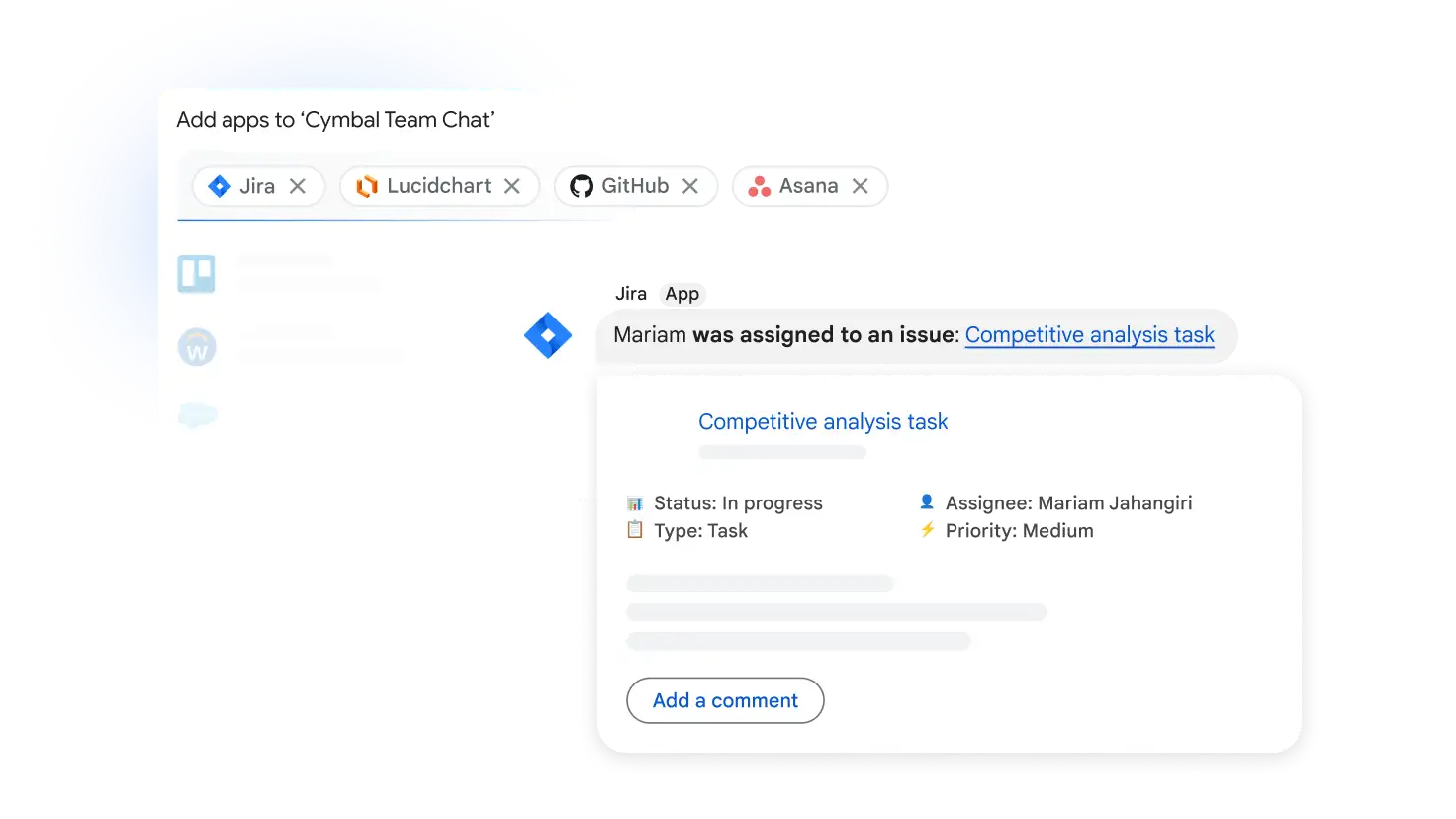 From Asana to Zapier, the apps and integrations that you need are available for Google Chat, including Asana, Comeen, Datadog, GitHub, HubSpot, Jira, Lucidchart, PagerDuty, Polly, Salesforce, ServiceNow, Trello, Workday and many more.