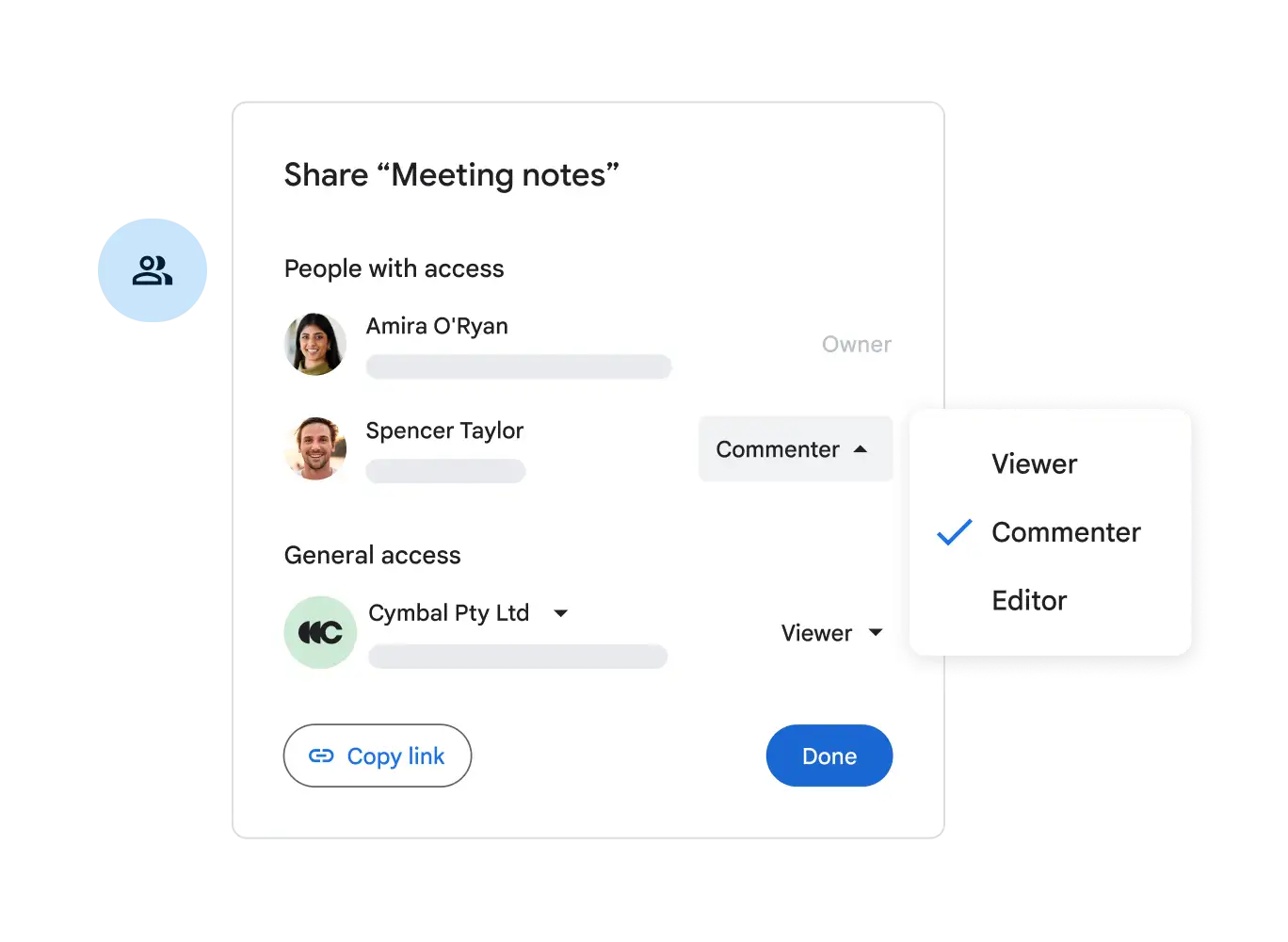Easily share files with customisable permissions (edit, comment, view). Control access further by preventing unwanted actions and setting expiry dates.