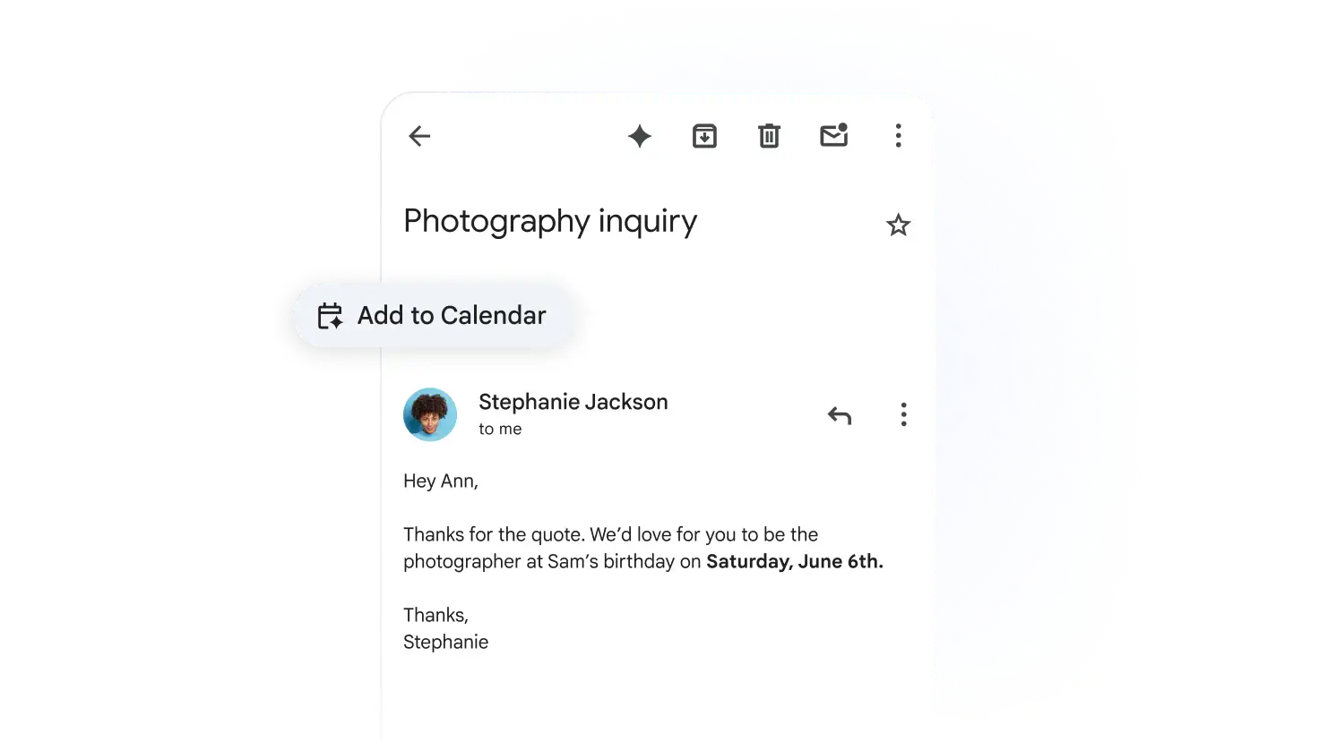 When Gemini detects event details in an email, simply click the 'Add to Calendar' button to save it to Calendar. Your event details will be accurately captured, directly from Gmail.