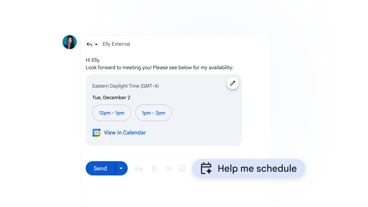 Help me schedule in Gmail: Gemini finds the best meeting times based on your email context and Google Calendar, so that you can share options and book faster, all in one tap.