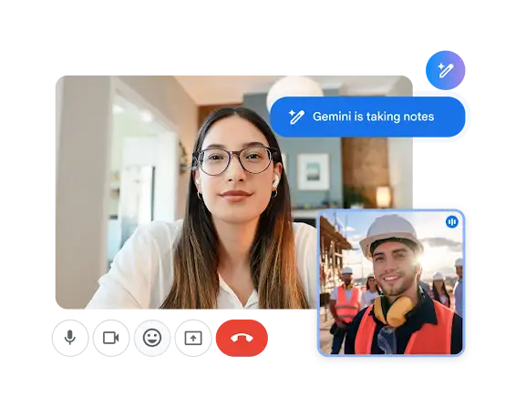 Look and sound your best with studio look, studio sound and studio lighting. Connect in 65+ languages with translated captions. Use 'take notes for me' for meeting details. Try all this and more to unlock the power of generative AI with Gemini for Google Workspace.