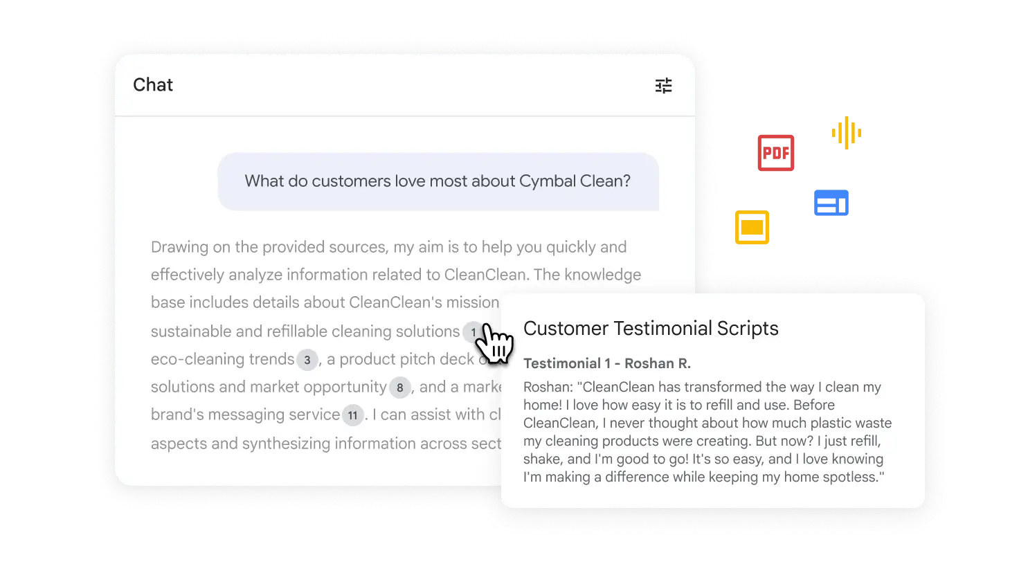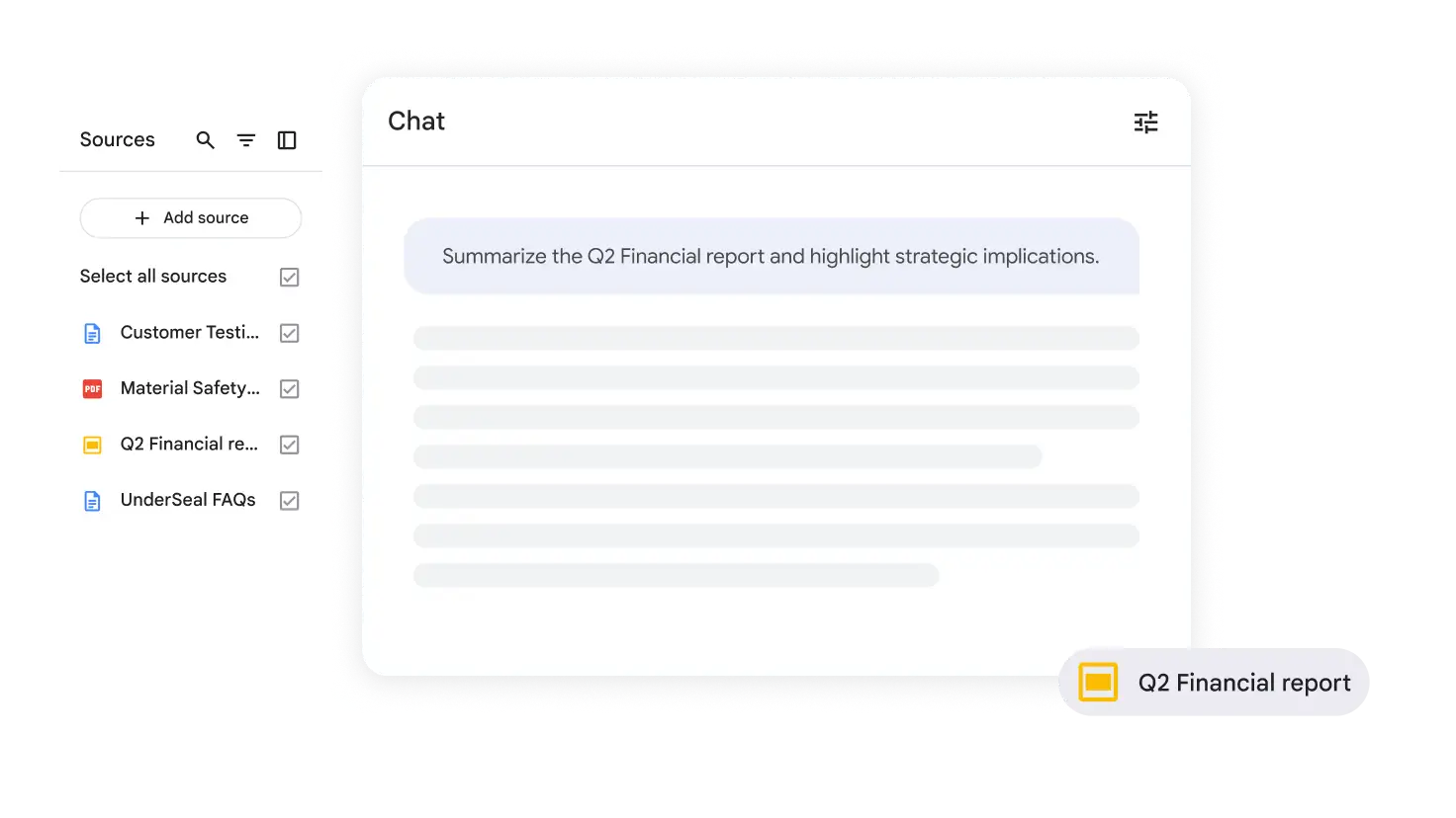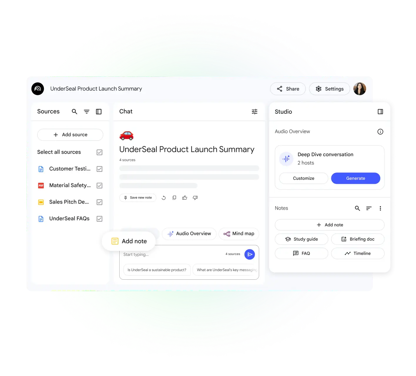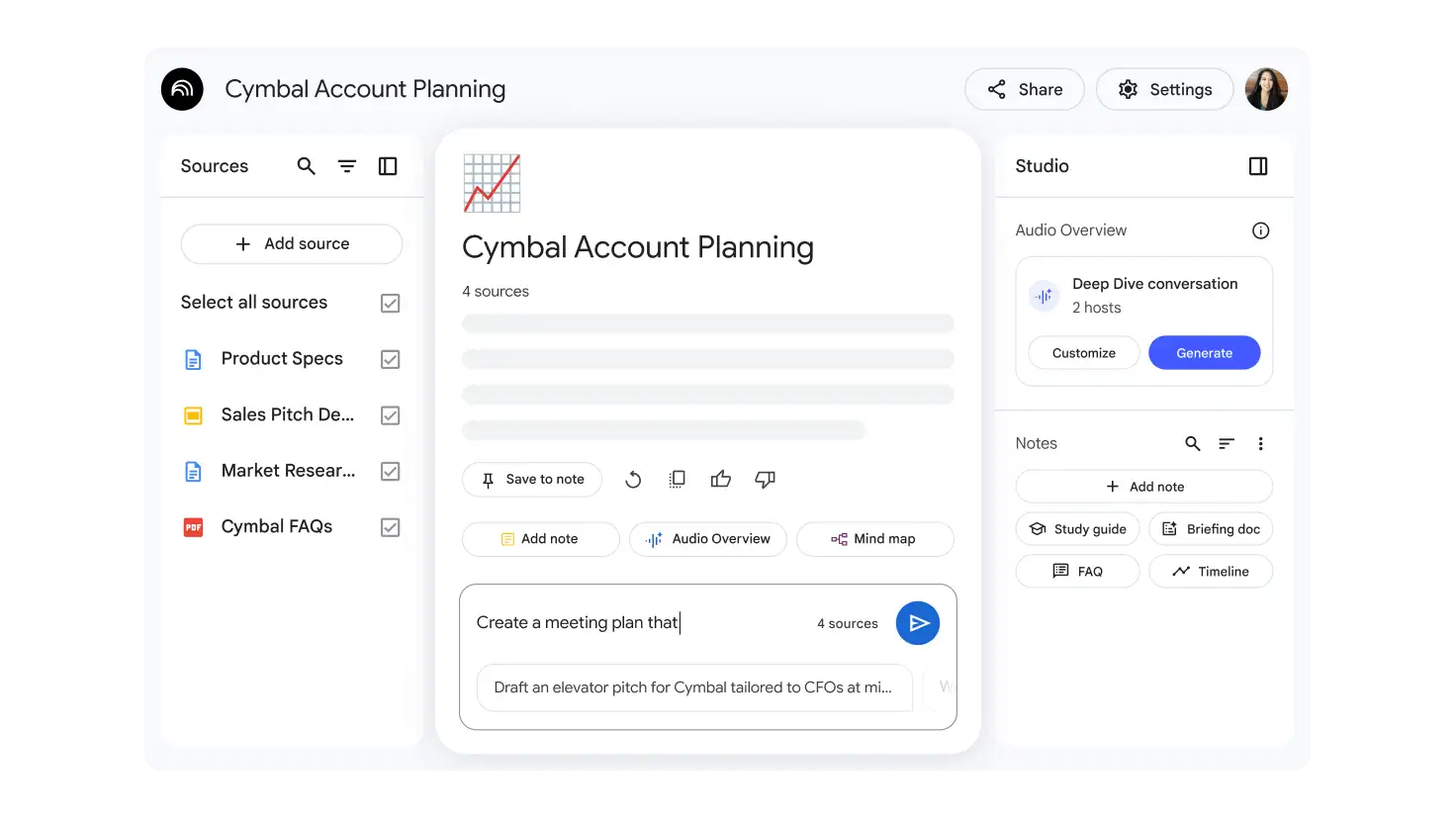Upload product specs and market research to NotebookLM. Ask NotebookLM to create tailored meeting plans and answer product questions for more confident sales conversations.