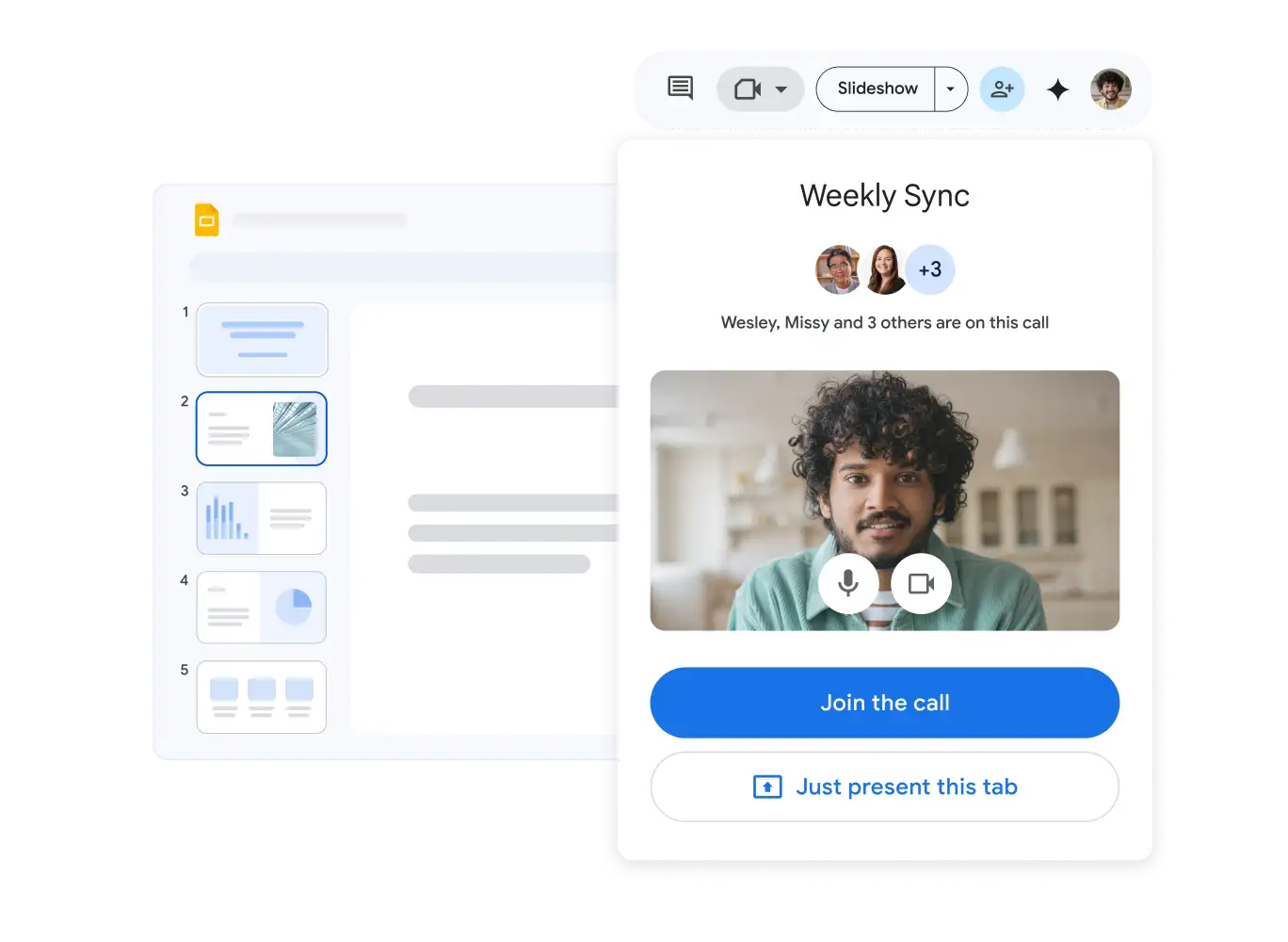 Collaborate in context by meeting in Google Slides, Docs or Slides.