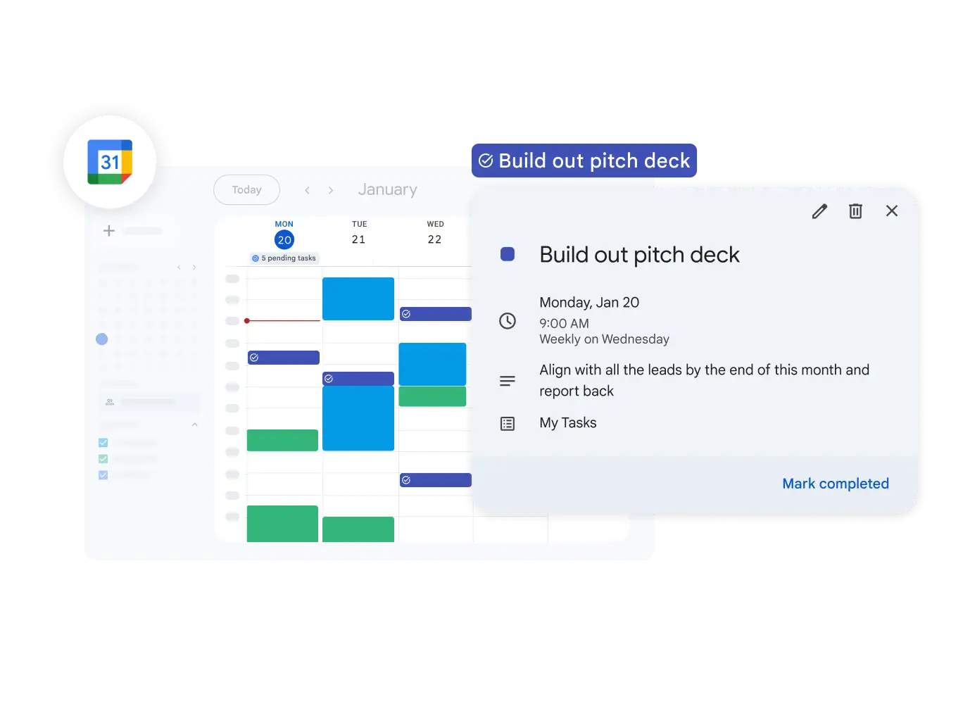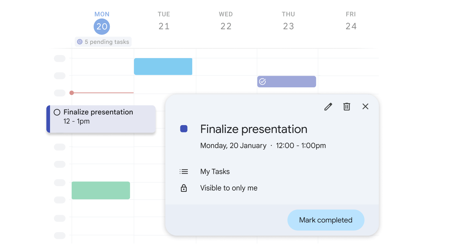 Add a date and time to any task and it will automatically appear in your Google Calendar – plus, you'll get reminders to help you stay on track and in control of your day. You can also add a duration and mark yourself as busy to avoid interruptions.