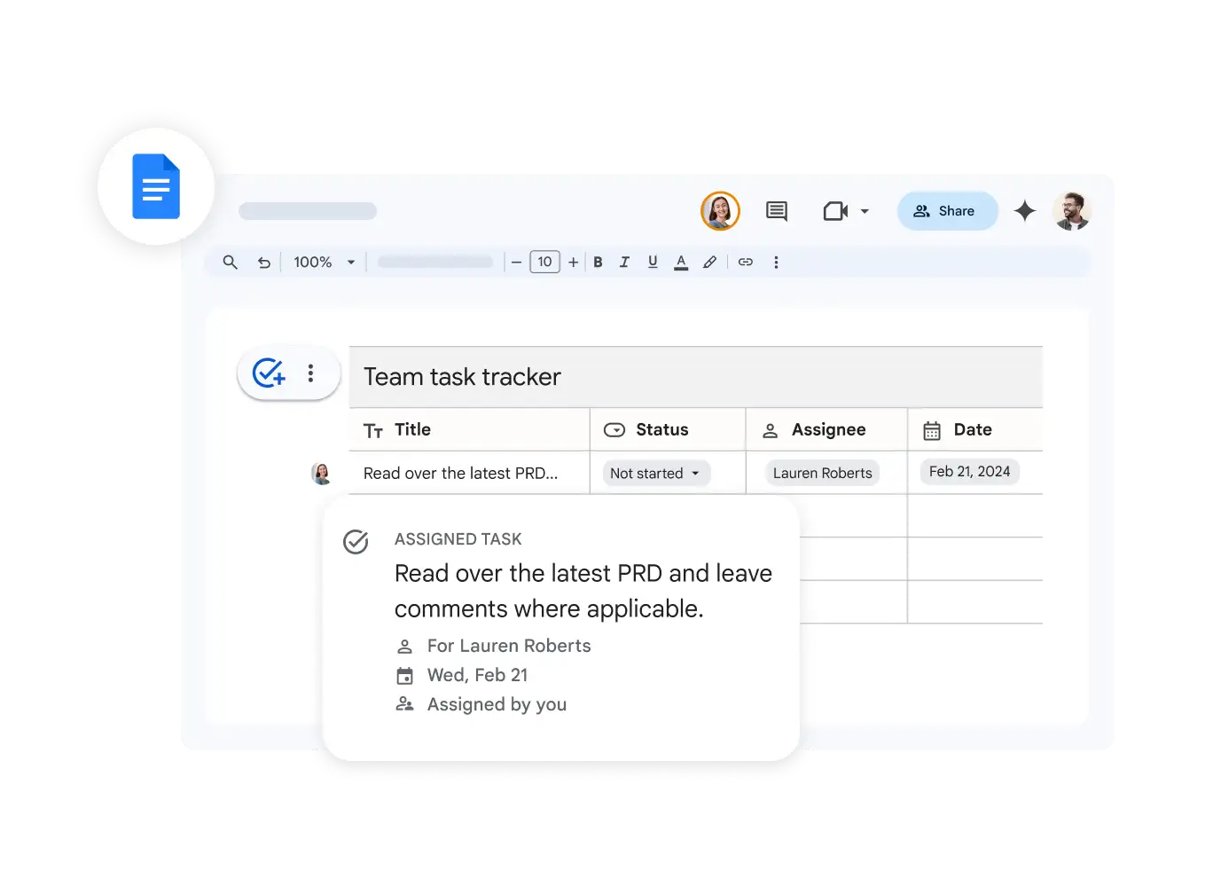 Using a few simple prompts, create professional, stylised and structured documents with images, tables and more. Get help refining your content, see the latest summary of your work and ask questions to improve and finalise your document. Try Google Workspace with Gemini today.