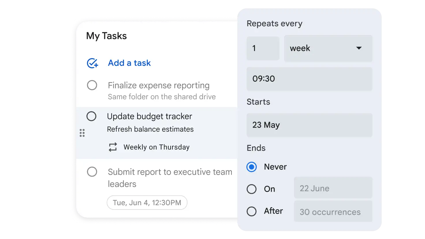 If you have recurring tasks – like sending a weekly recap or submitting a monthly expense report – you can set them to repeat daily, weekly, monthly or annually. Stay on top of your ongoing to-dos without manually adding them each time.