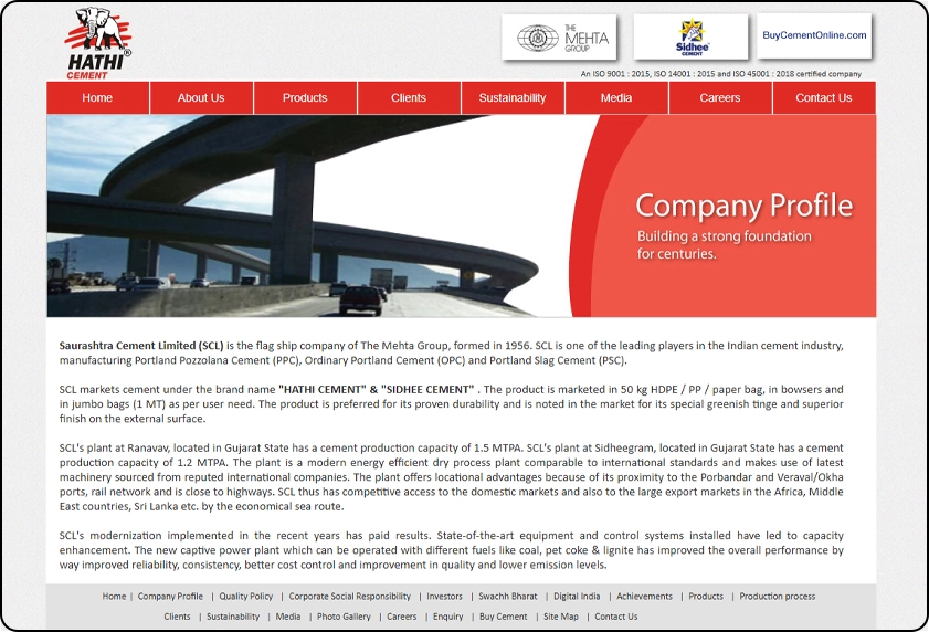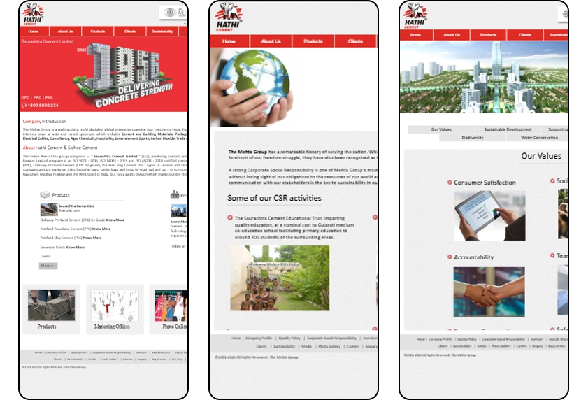 The Hathi Sidhee Cements website was developed as a corporate platform to represent Saurashtra Cement Limited and its flagship brands “Hathi” and “Sidhee.” The website showcases the company’s legacy as part of the Mehta Group, a global enterprise operating across multiple industries. It includes detailed sections such as company profile, product portfolio, production process, sustainability initiatives, clients, media, and investor-related information.