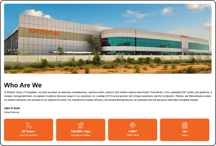 The Kirtanlal website was developed as a central digital platform to represent the group company and its multiple business verticals. Over the years, the organisation had expanded into Engineering Components, Trading & Distribution, and Scaffolding & Formworks, but the digital presence did not reflect this growth. Each vertical had its own independent website, leading to inconsistencies in design, messaging, and brand identity. The objective of this project was to create a master website that establishes Kirtanlal as the parent brand while clearly showcasing its diverse verticals, legacy, and capabilities. The website was also designed to highlight the company’s years of experience, business strength, and CSR initiatives, while acting as a foundation for all future digital assets. Multiple design explorations and layout variations were undertaken to ensure the final structure supports long-term scalability and evolving business needs
