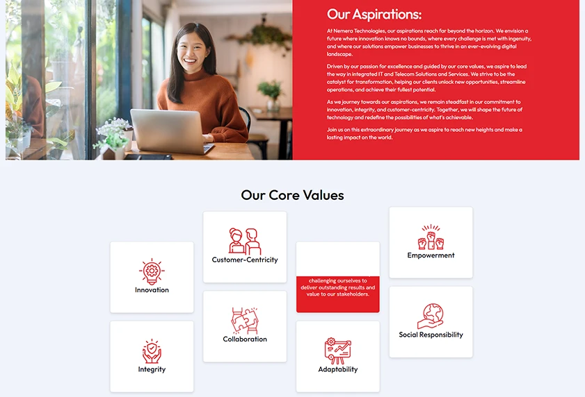 Think Technology Services partnered with Nemera Technologies to redesign their corporate website with a strong focus on clarity, performance, and brand alignment. The existing website housed a wide range of services but lacked a cohesive structure and modern visual appeal. The objective was to deliver a refreshed digital presence that effectively showcased Nemera’s offerings while aligning seamlessly with their brand identity, including logo usage, colour palette, and content hierarchy.
