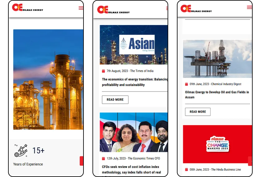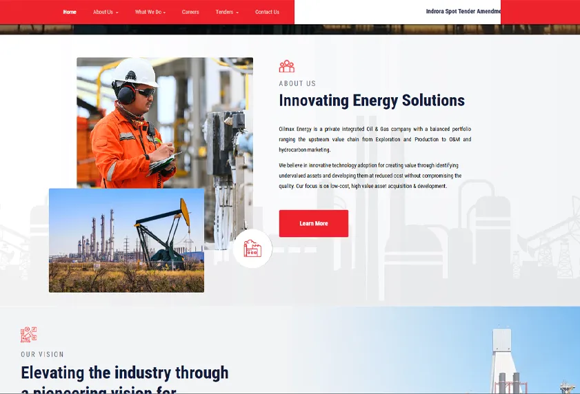The Oilmax website was developed as a corporate platform to represent its integrated presence across the upstream oil & gas value chain, including exploration, production, project execution, and hydrocarbon marketing. The website highlights key operational assets such as oil blocks in Gujarat and Assam (Indrora, Tiphuk, Duarmara, Amguri), along with detailed project-level information like location, ownership, and production insights. It also showcases the company’s vision around sustainable energy, HS&E policies, and technology-driven asset development. Dedicated sections for group companies, CSR initiatives, leadership, and news & media were structured to reflect both operational scale and corporate responsibility. The platform also emphasizes community initiatives such as electrification projects, healthcare camps, and skill development programs, reinforcing the company’s commitment beyond core operations.