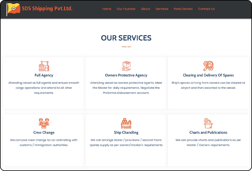 The objective was to translate SDS Shipping’s extensive legacy into a modern, structured, and professional website that clearly communicates its nationwide port coverage, service capabilities, and cargo-handling expertise. The website needed to present complex operational information—such as the range of ports serviced, vessel types handled, and cargo categories—in a clear and easily navigable format for principals, charterers, and industry stakeholders.