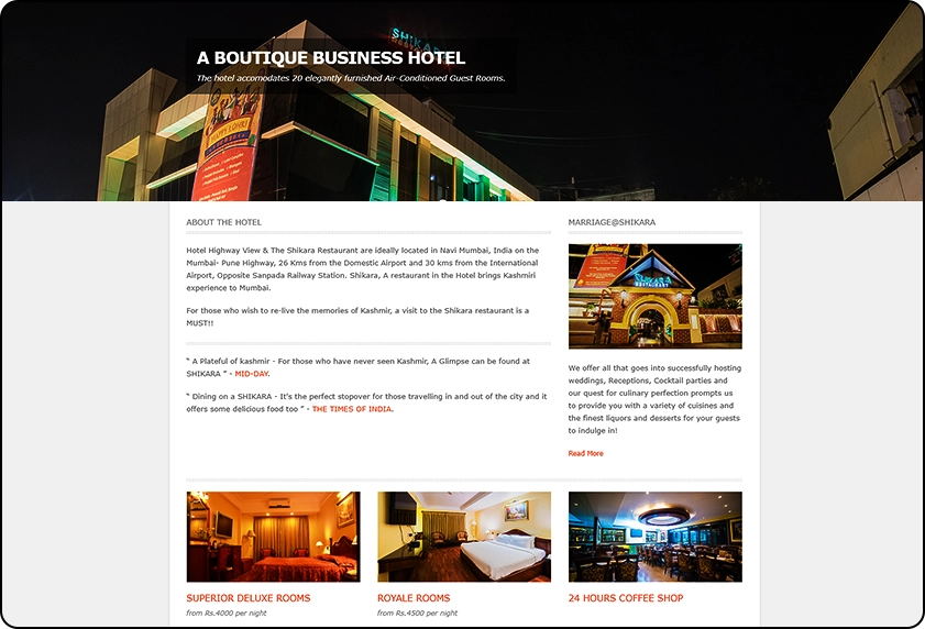 The Shikara website was designed as a central digital hub representing multiple business verticals under one umbrella, including hospitality (Hotel Highway View), dining (Shikara Restaurant), and real estate (Shikara Constructions). The platform highlights the brand’s diverse offerings in a structured manner, allowing users to explore hotel stays, restaurant experiences, and property developments seamlessly from a single interface. The website showcases key highlights such as deluxe accommodations, Kashmiri-themed dining experiences, and real estate projects like Shikara Heights, while maintaining a consistent brand narrative across all segments.